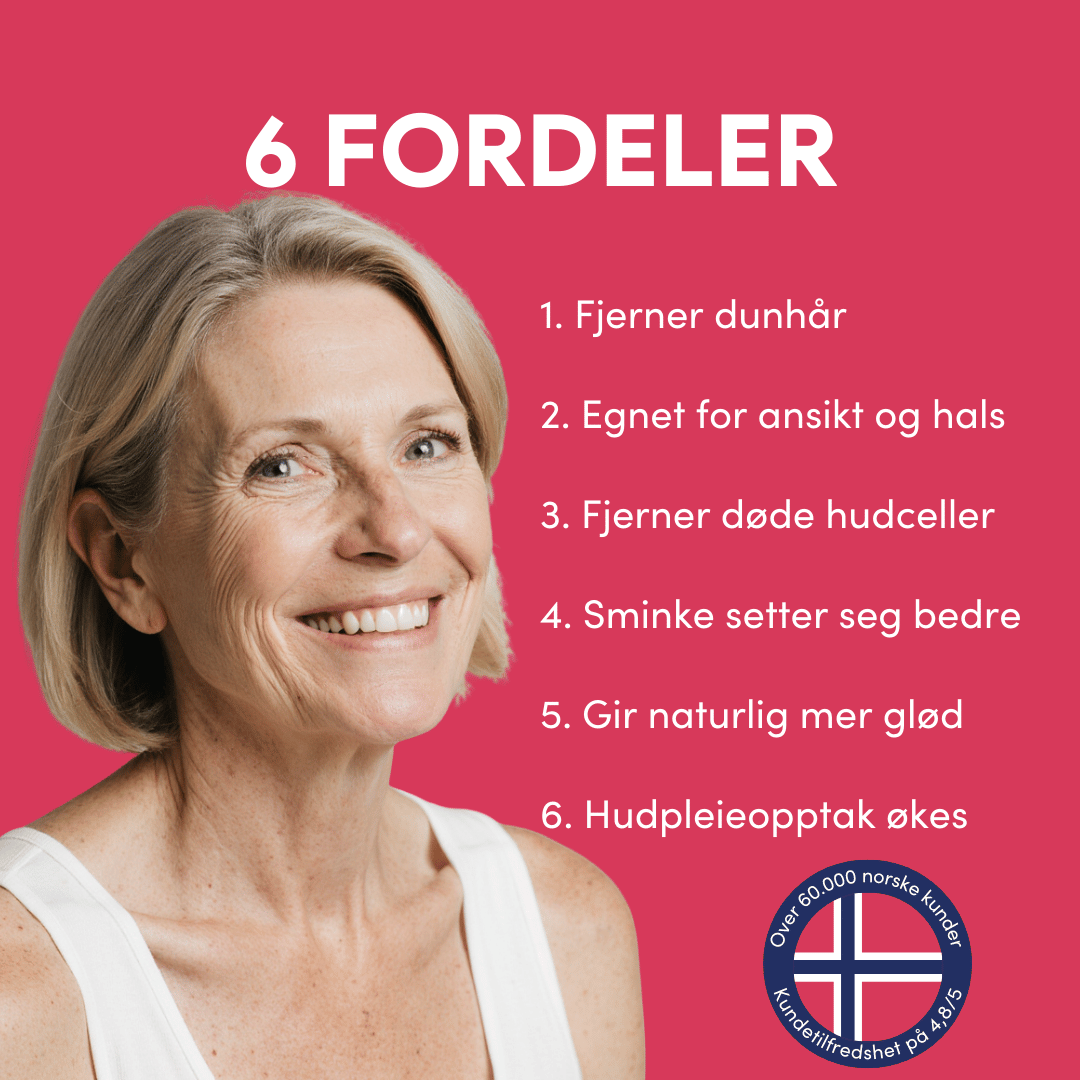Få glattere, ungdommelig og strålende hud uten dunhår på 5 min. Banebrytende sonisk teknologi gjør enkel og trygg fjerning av dunhår og død hud mulig – som å gjøre dermaplaning i klinikk.